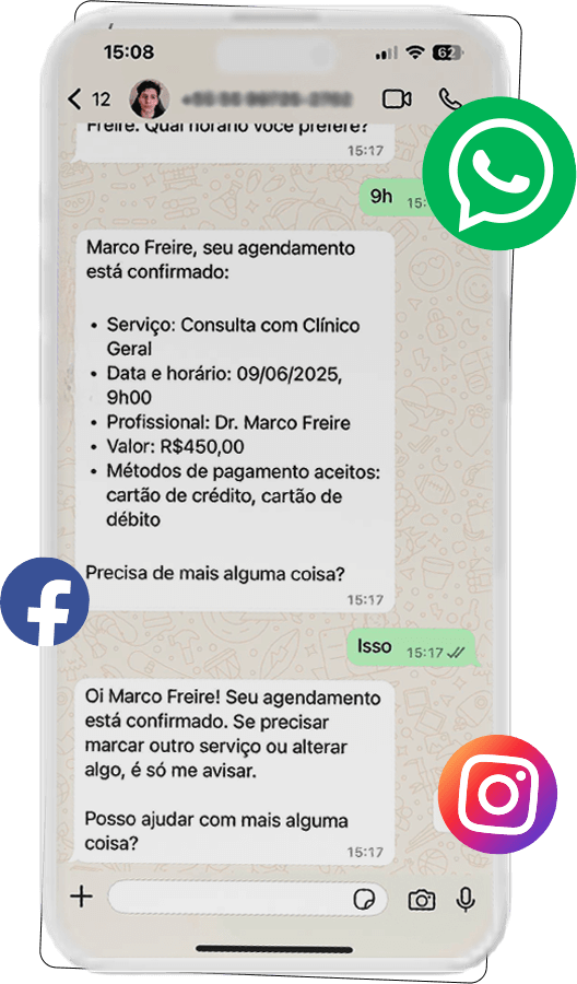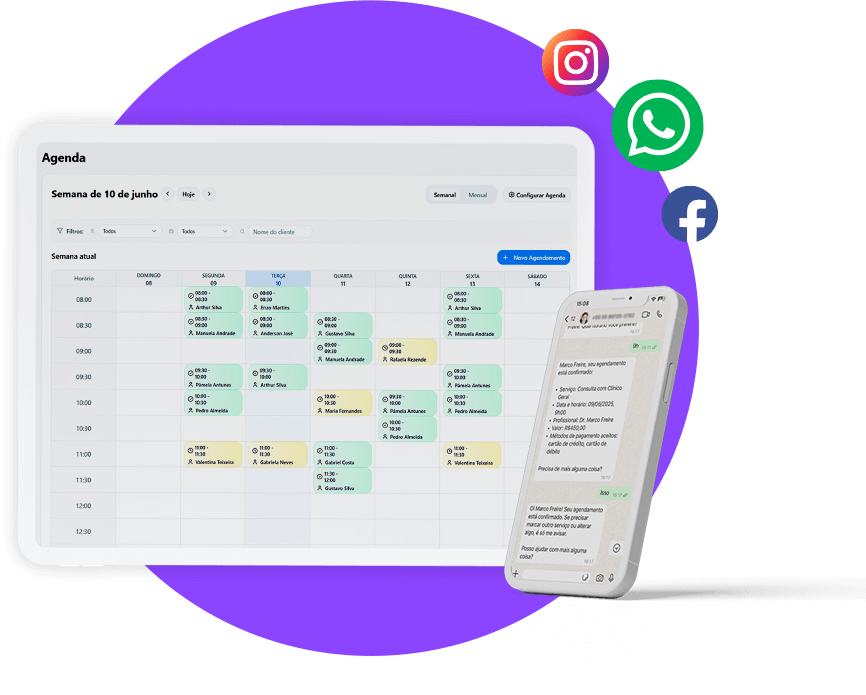 Agendamentos, reagendamentos e cancelamentos via WhatsApp, Instagram, Facebook e site — tudo em um só lugar, com inteligência artificial treinada para sua especialidade.